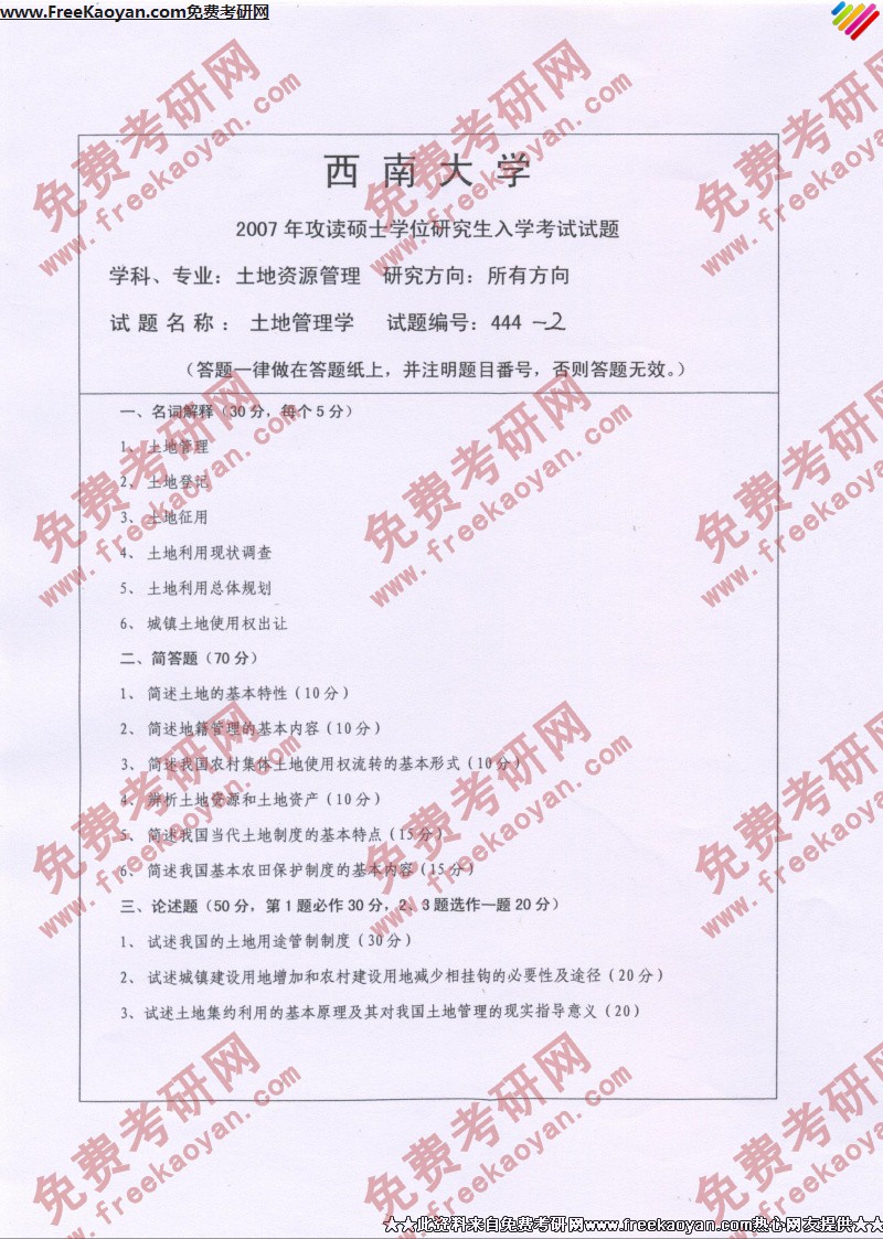 专业课考研经验 本站小编 FreeKaoyan 2018-01-23西南大学2007年考研真题-土地管理学