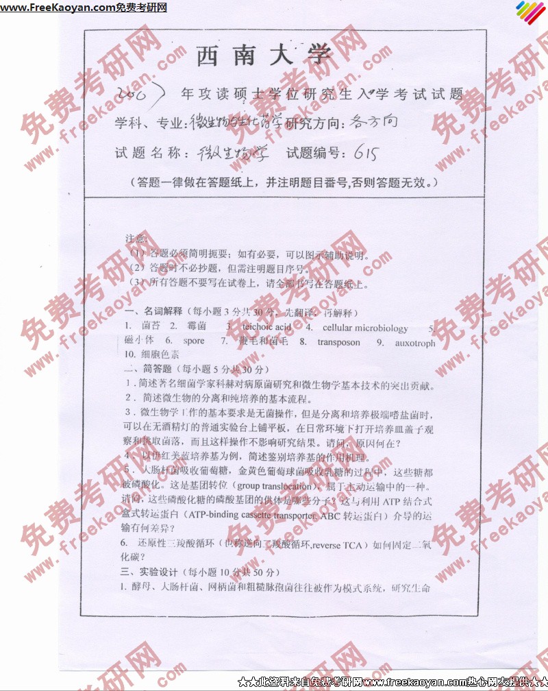 专业课考研经验 本站小编 FreeKaoyan 2018-01-23西南大学2007年考研真题-食品化学与食品生物学