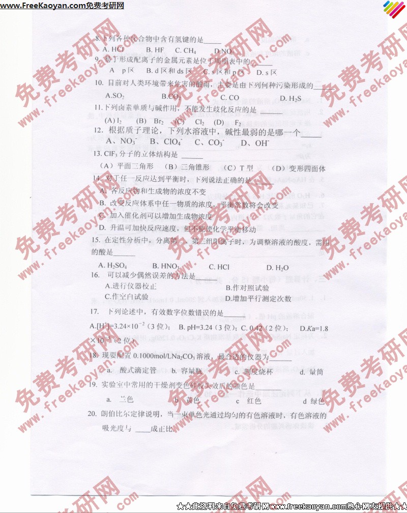 专业课考研经验 本站小编 FreeKaoyan 2018-01-23西南大学2007年考研真题-无机化学及分析化学