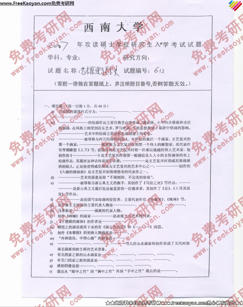西南大学2007年考研真题-艺术理论与美术(含书法)史
