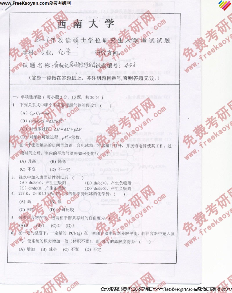 相关话题/考研真题 西南大学 物理化学 有机化学