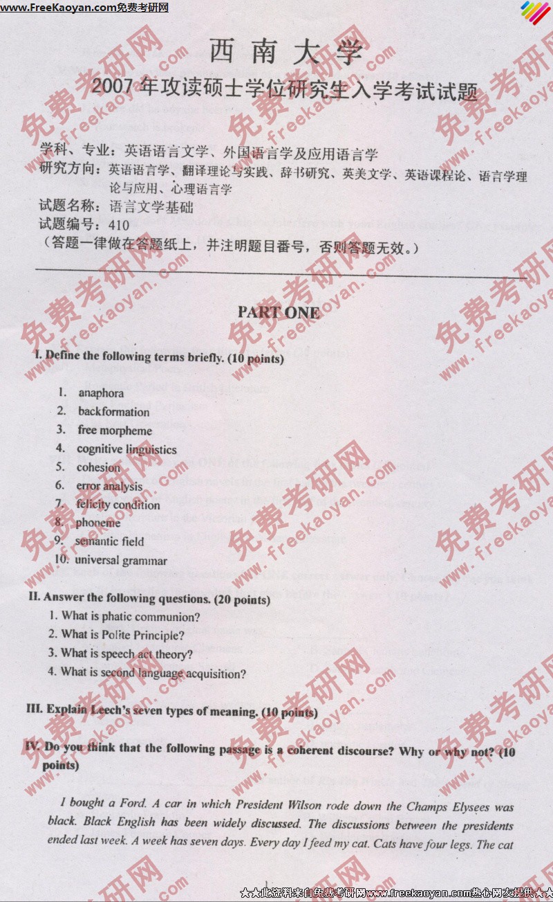 专业课考研经验 本站小编 FreeKaoyan 2018-01-23西南大学2007年考研真题-英语综合考试