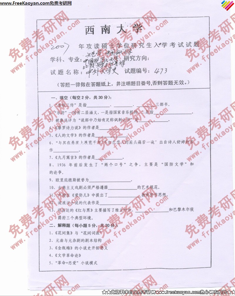 专业课考研经验 本站小编 FreeKaoyan 2018-01-23西南大学2007年考研真题-英语综合考试
