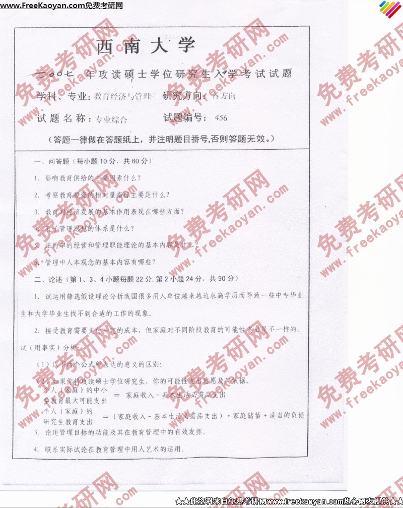 专业课考研经验 本站小编 FreeKaoyan 2018-01-23西南大学2007年考研真题-政治