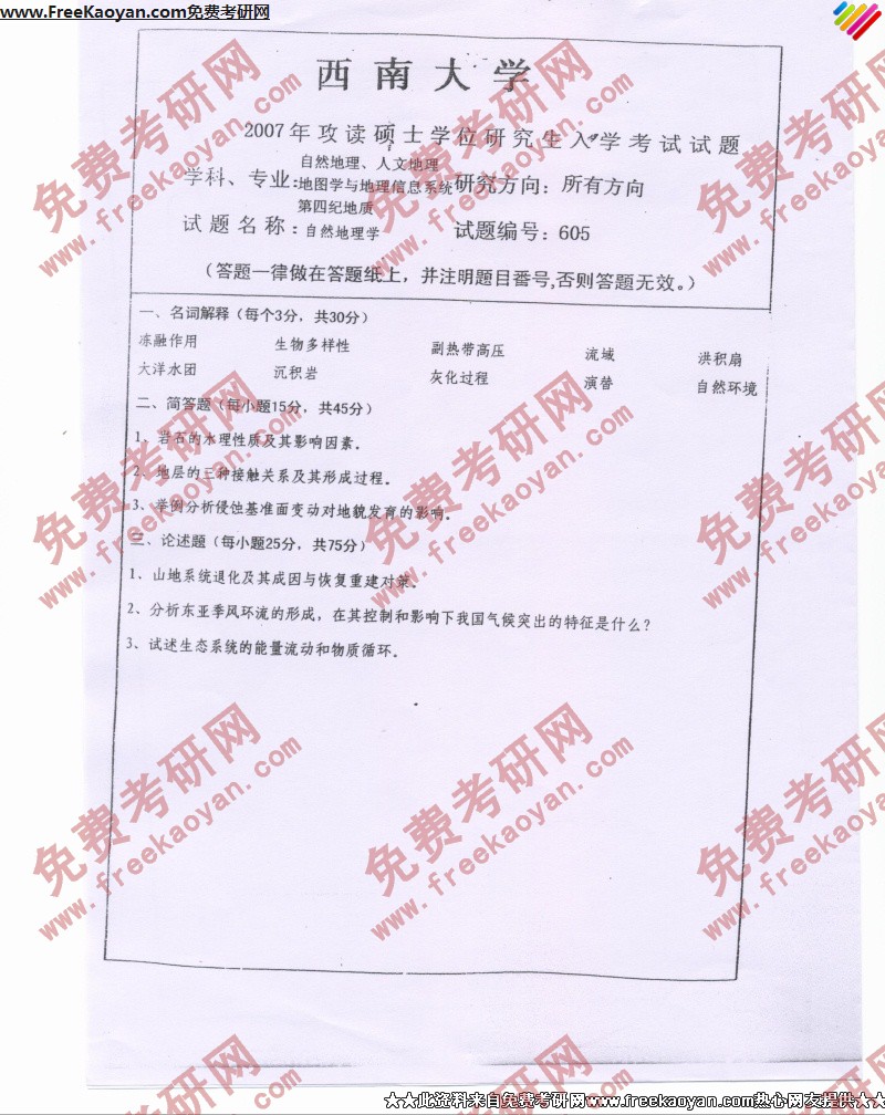 专业课考研经验 本站小编 FreeKaoyan 2018-01-23西南大学2007年考研真题-专业综合