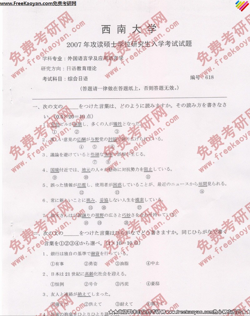 专业课考研经验 本站小编 FreeKaoyan 2018-01-23西南大学2007年考研真题-综合课