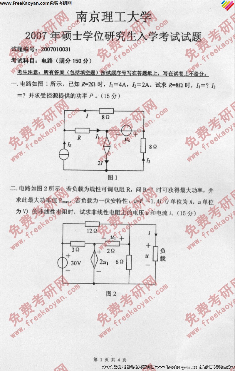 南京理工大学2007年考研真题-电路