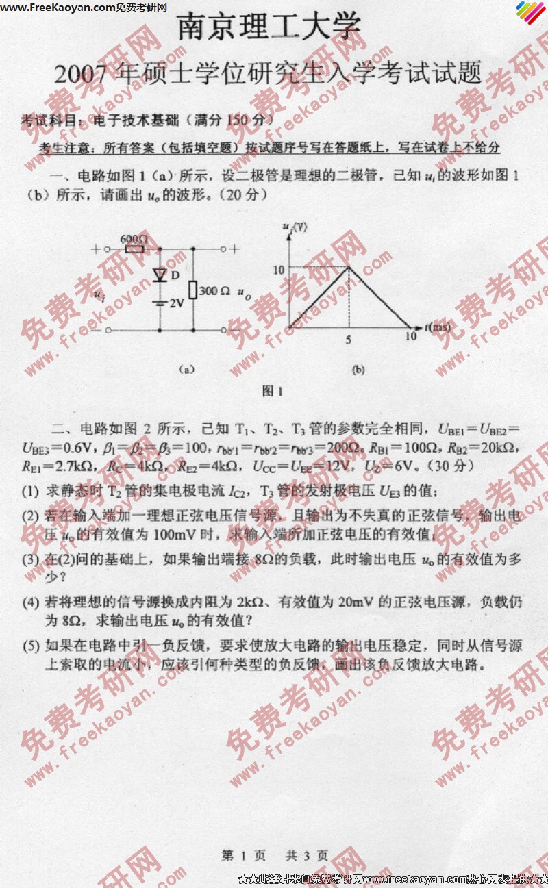 专业课考研经验 本站小编 FreeKaoyan 2018-01-23南京理工大学2007年考研真题-电子技术