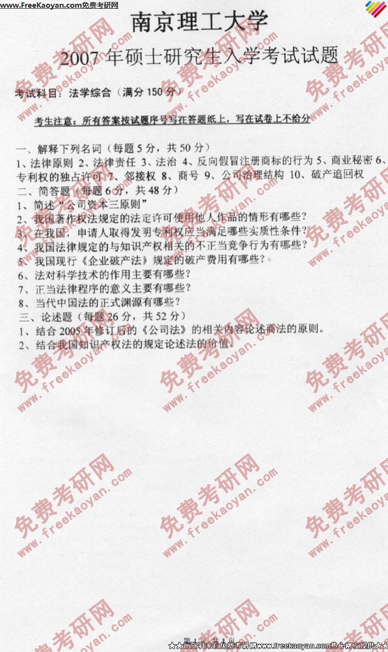 专业课考研经验 本站小编 FreeKaoyan 2018-01-23南京理工大学2007年考研真题-单独考政治