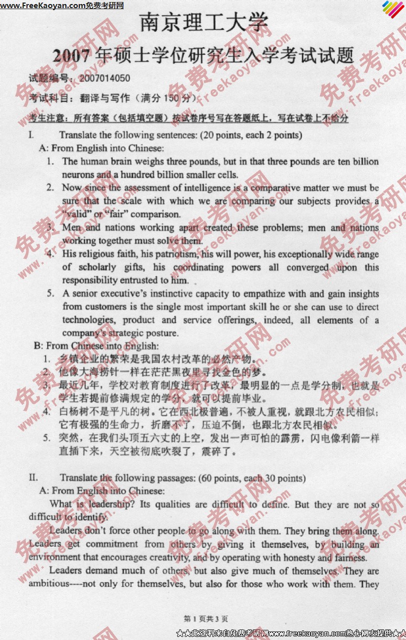 专业课考研经验 本站小编 FreeKaoyan 2018-01-23南京理工大学2007年考研真题-单独考试英语