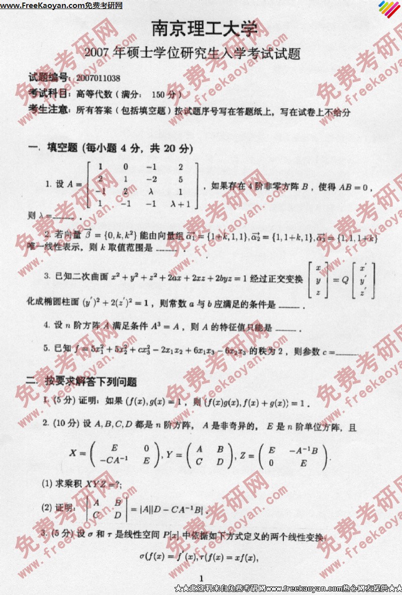 南京理工大学2007年考研真题-高等代数