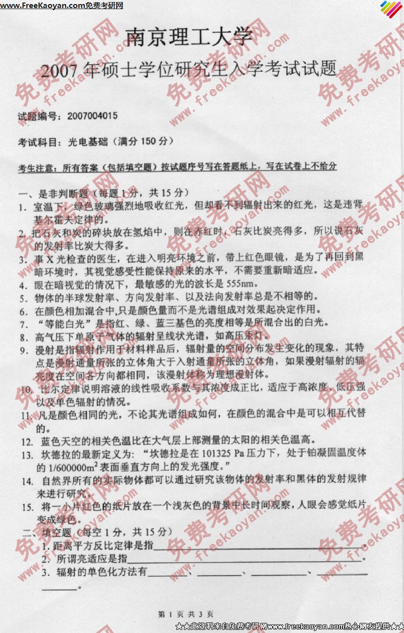 专业课考研经验 本站小编 FreeKaoyan 2018-01-23南京理工大学2007年考研真题-分析化学