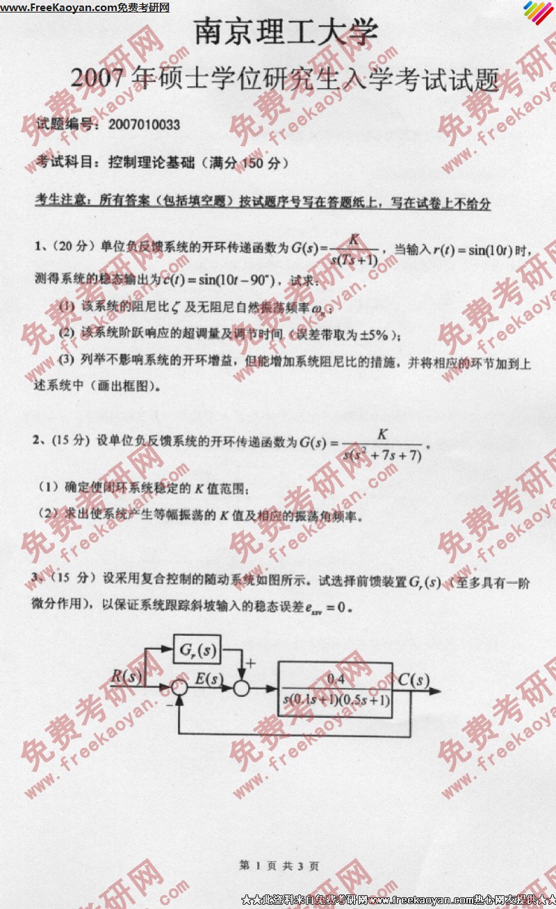 南京理工大学2007年考研真题-控制理论基础