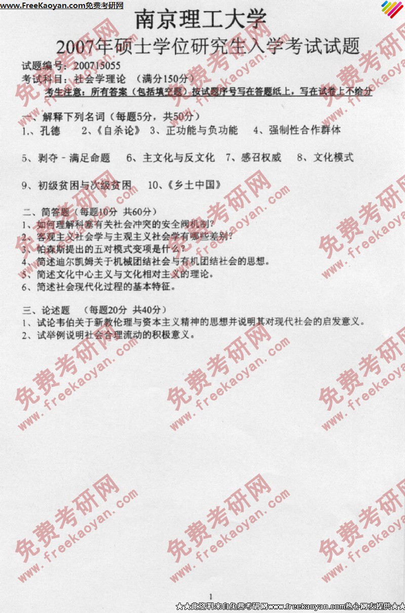 南京理工大学2007年考研真题-社会学理论