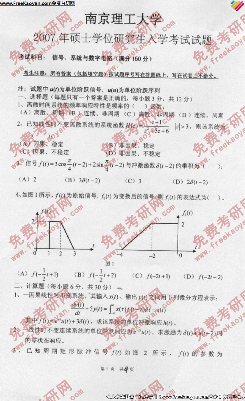 南京理工大学2007年考研真题-信号系统与数字电路