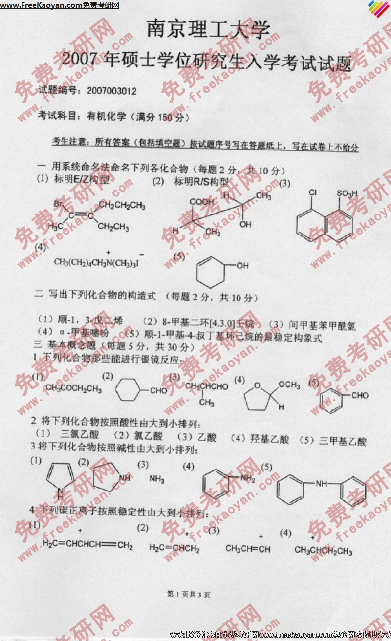 专业课考研经验 本站小编 FreeKaoyan 2018-01-23南京理工大学2007年考研真题-无机化学