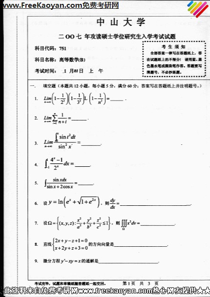 专业课考研经验 本站小编 FreeKaoyan 2018-01-23中山大学2007年考研真题-高等数学(A)