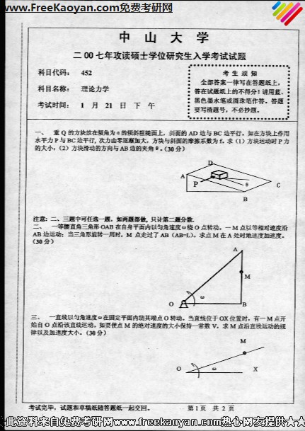 中山大学2007年考研真题-理论力学