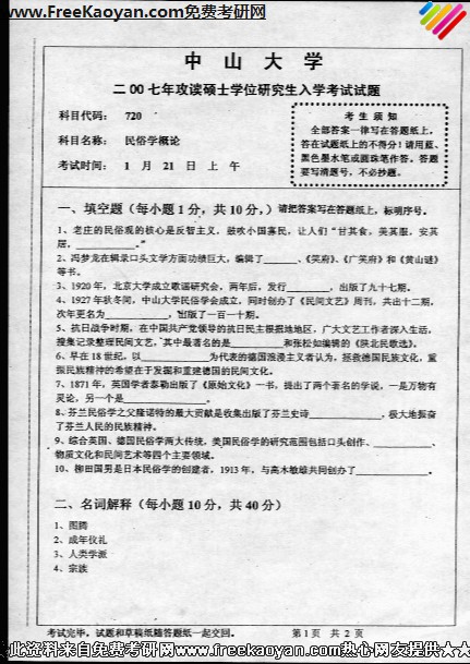 专业课考研经验 本站小编 FreeKaoyan 2018-01-23中山大学2007年考研真题-民间文学概论