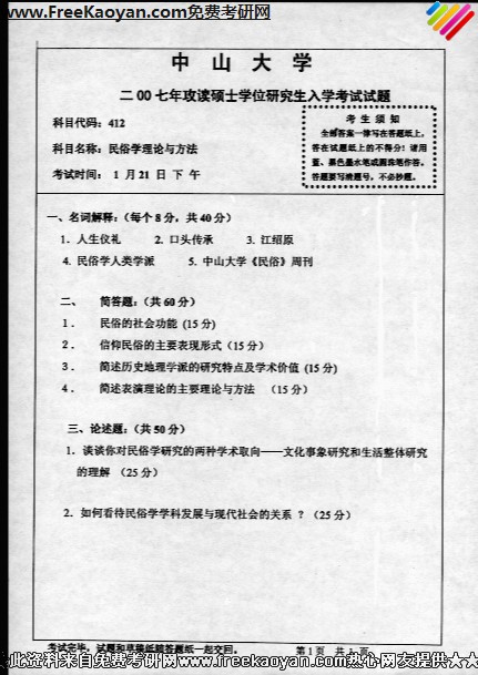 专业课考研经验 本站小编 FreeKaoyan 2018-01-23中山大学2007年考研真题-民间文学概论