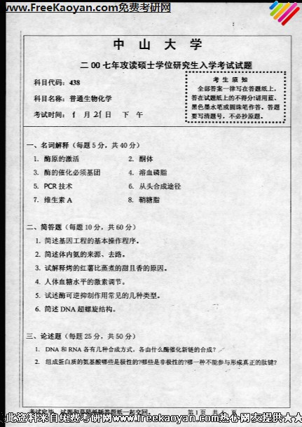 中山大学2007年考研真题-普通生物化学