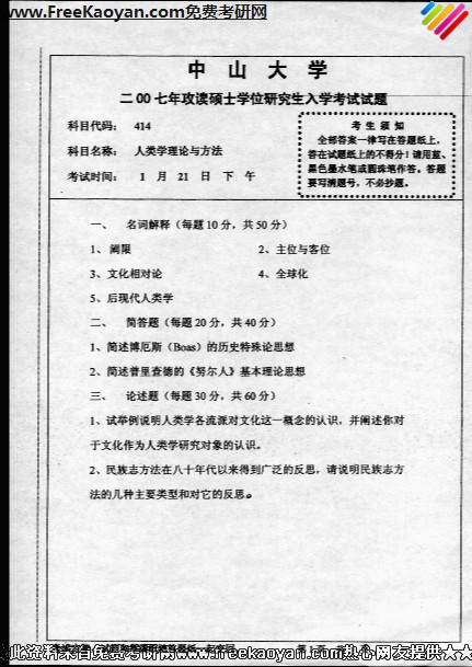 专业课考研经验 本站小编 FreeKaoyan 2018-01-23中山大学2007年考研真题-民族学理论与方法
