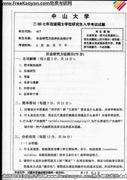 中山大学2007年考研真题-社会研究方法和社会统计学