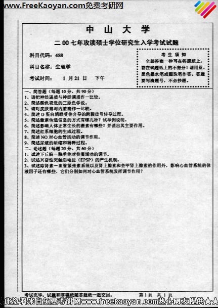 专业课考研经验 本站小编 FreeKaoyan 2018-01-23中山大学2007年考研真题-普通动物学