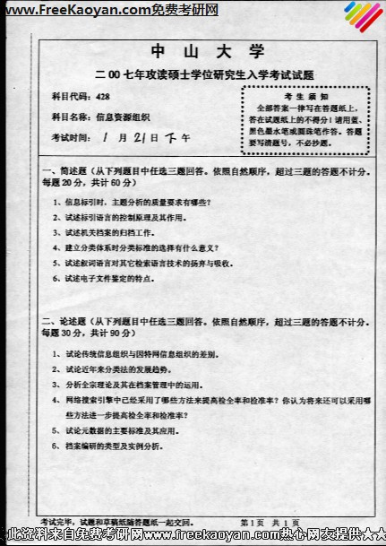 专业课考研经验 本站小编 FreeKaoyan 2018-01-23中山大学2007年考研真题-信息管理基础