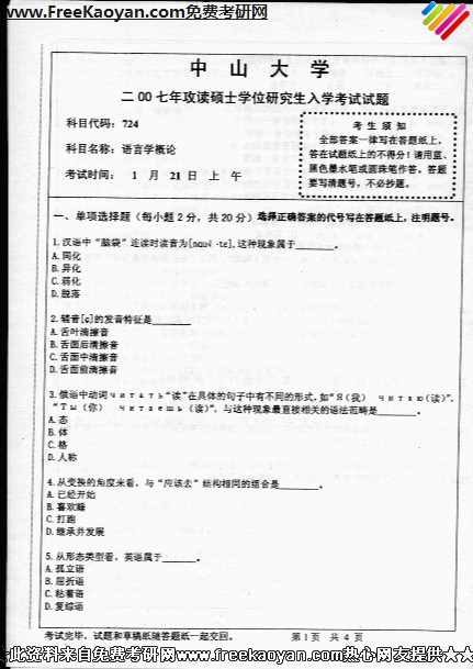 中山大学2007年考研真题-语言学概论724