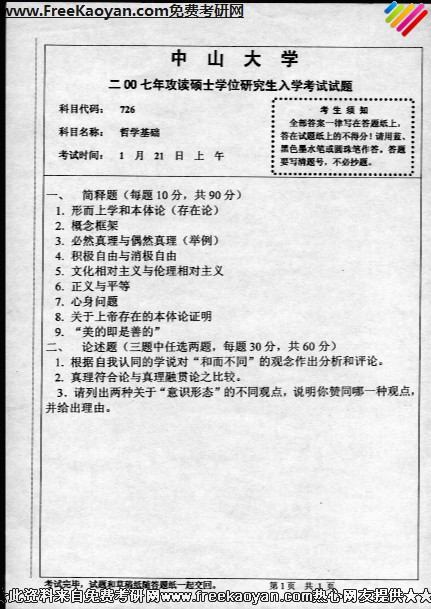 中山大学2007年考研真题-哲学基础