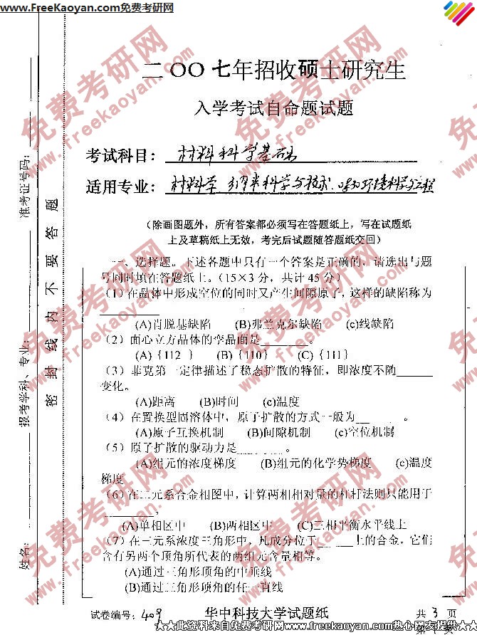 华中科技大学2007年考研真题-材料科学基础