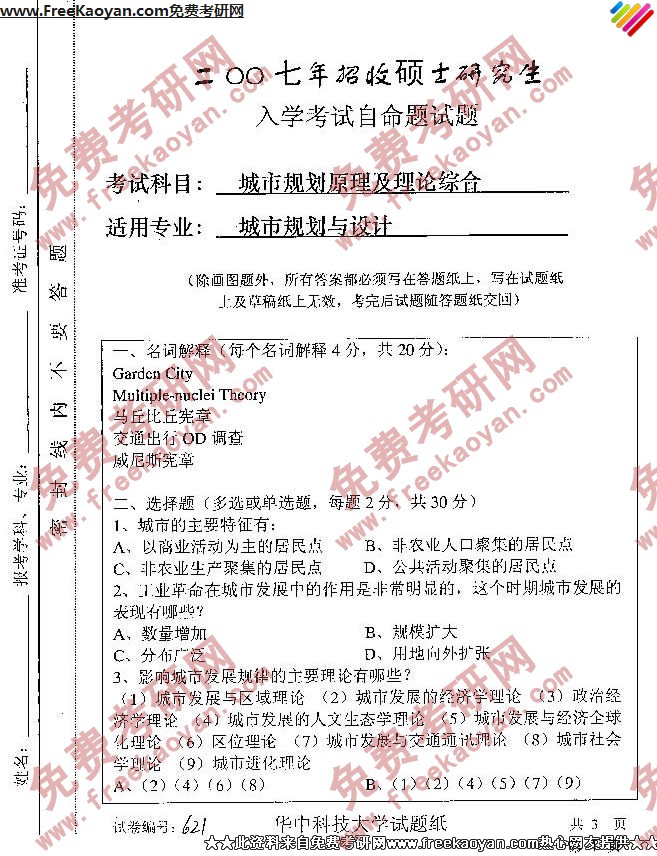 专业课考研经验 本站小编 FreeKaoyan 2018-01-23华中科技大学2007年考研真题-城市规划原理