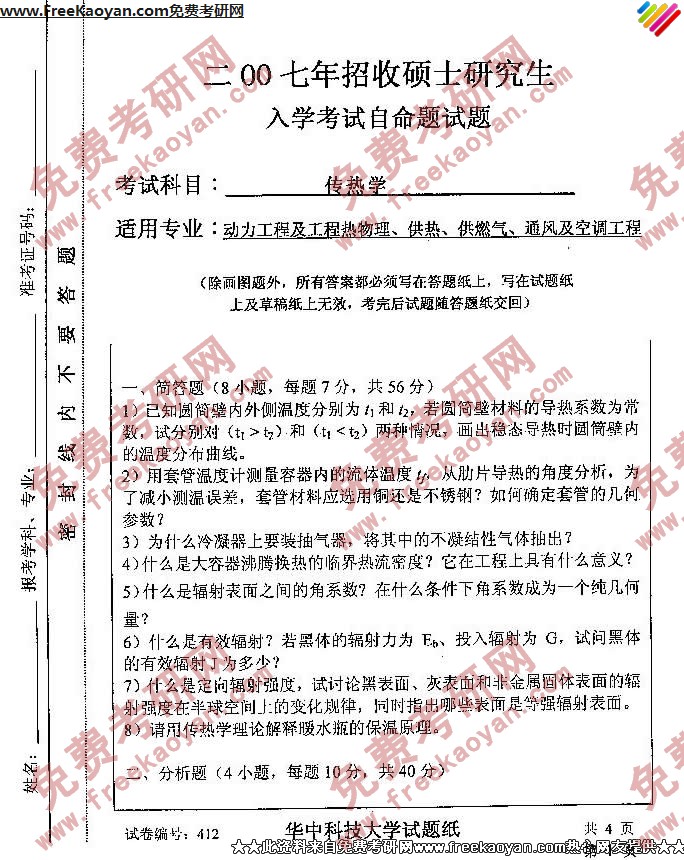 专业课考研经验 本站小编 FreeKaoyan 2018-01-23华中科技大学2007年考研真题-材料成形原理