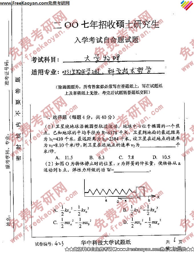 华中科技大学2007年考研真题-大学物理