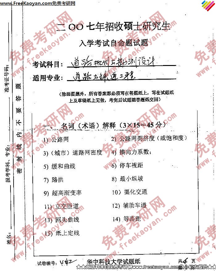 华中科技大学2007年考研真题-道路规划与勘测设计