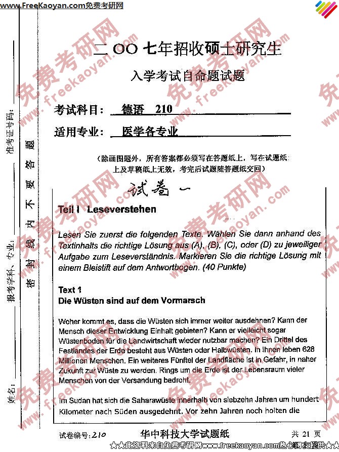 专业课考研经验 本站小编 FreeKaoyan 2018-01-23华中科技大学2007年考研真题-材料成形原理
