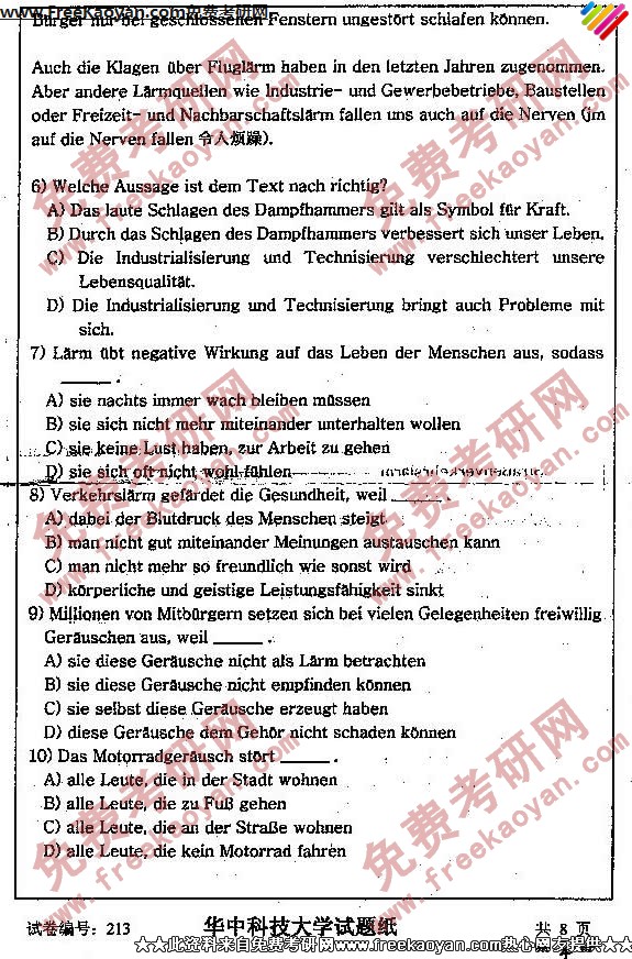 专业课考研经验 本站小编 FreeKaoyan 2018-01-23华中科技大学2007年考研真题-德语