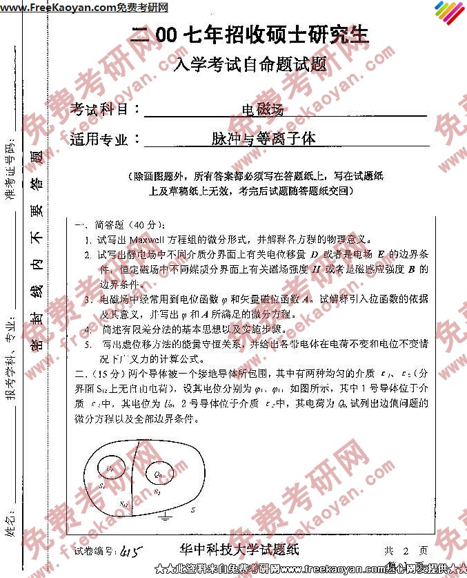 专业课考研经验 本站小编 FreeKaoyan 2018-01-23华中科技大学2007年考研真题-大学物理