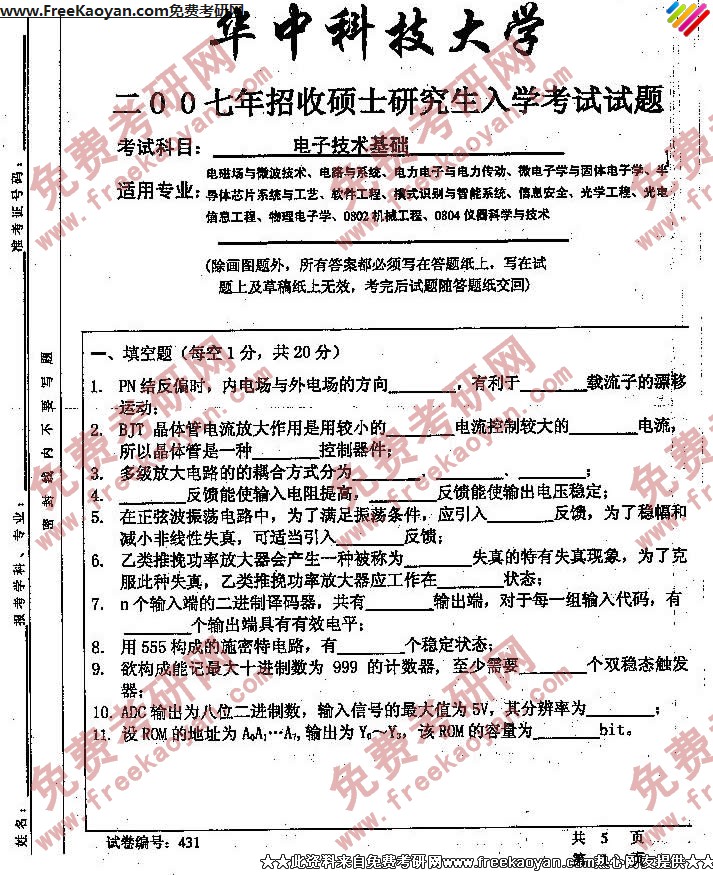 专业课考研经验 本站小编 FreeKaoyan 2018-01-23华中科技大学2007年考研真题-电磁场