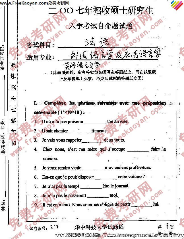 相关话题/考研真题 华中科技大学 外国语言学 法语