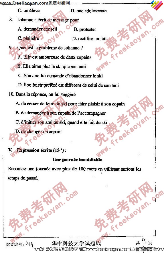 相关话题/考研真题 华中科技大学 外国语言学 法语
