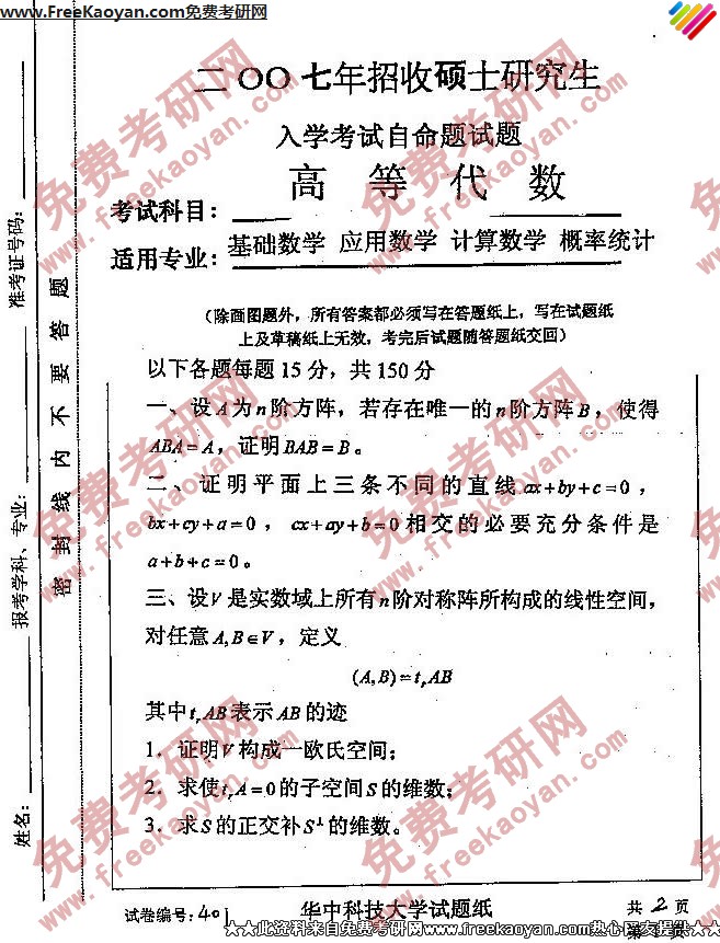 华中科技大学2007年考研真题-高等代数