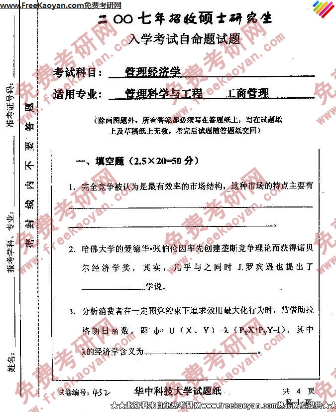 专业课考研经验 本站小编 FreeKaoyan 2018-01-23华中科技大学2007年考研真题-工程经济与项目管理