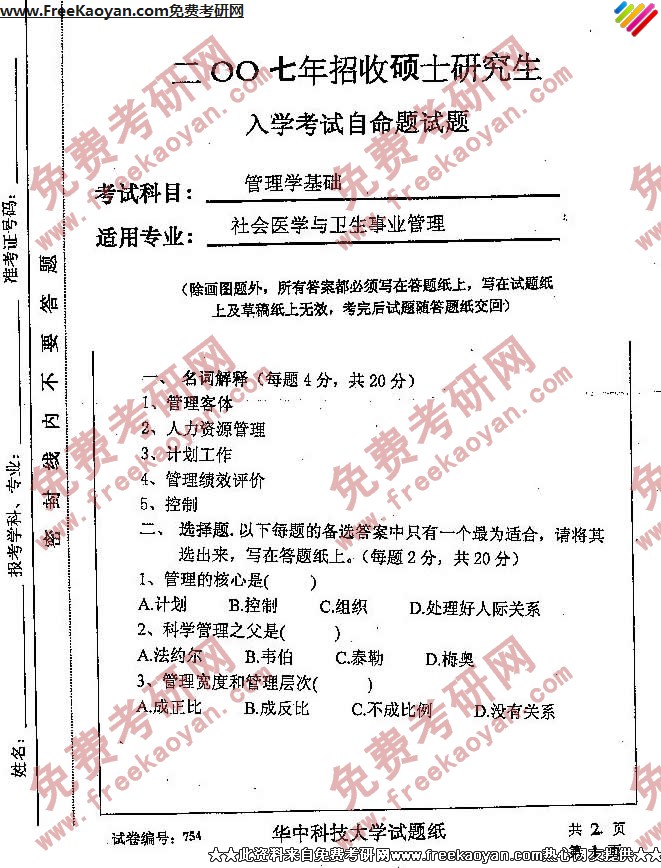 专业课考研经验 本站小编 FreeKaoyan 2018-01-23华中科技大学2007年考研真题-管理学