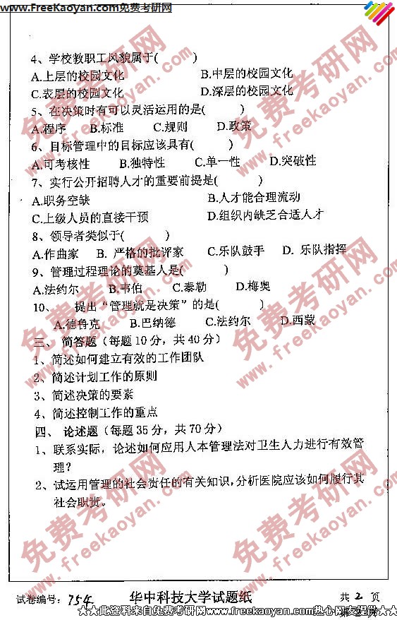 专业课考研经验 本站小编 FreeKaoyan 2018-01-23华中科技大学2007年考研真题-管理学