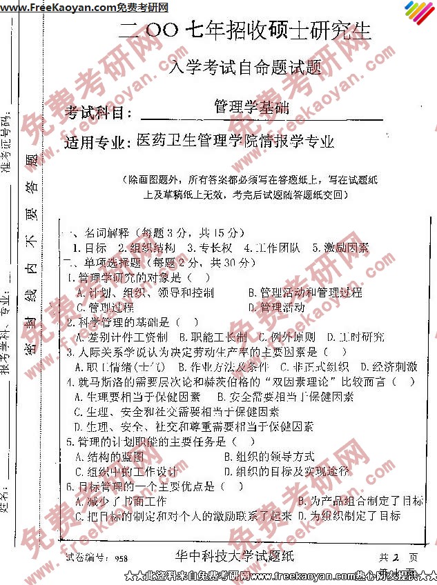 华中科技大学2007年考研真题-管理学基础958