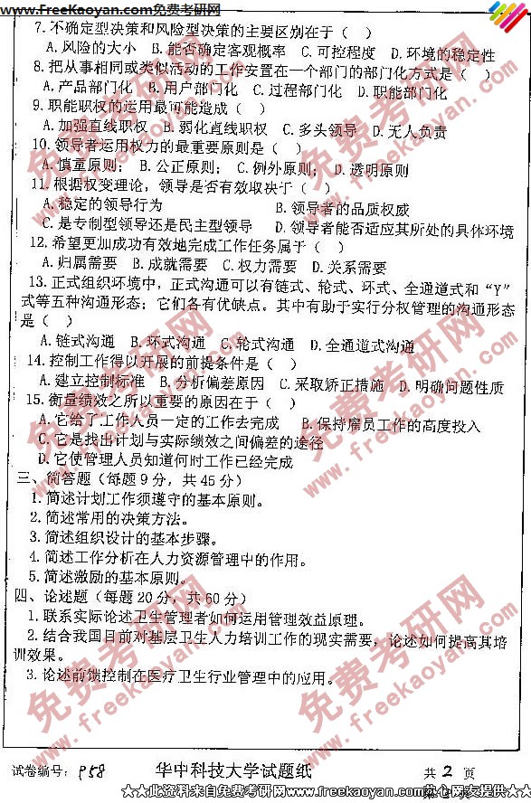专业课考研经验 本站小编 FreeKaoyan 2018-01-23华中科技大学2007年考研真题-管理学