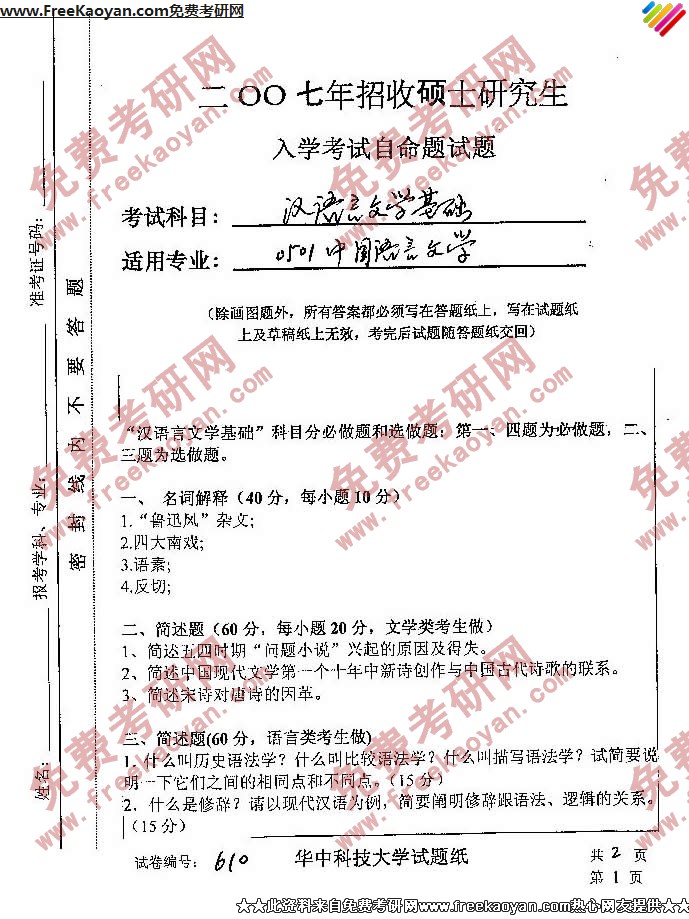 专业课考研经验 本站小编 FreeKaoyan 2018-01-23华中科技大学2007年考研真题-法语(外国语言学)