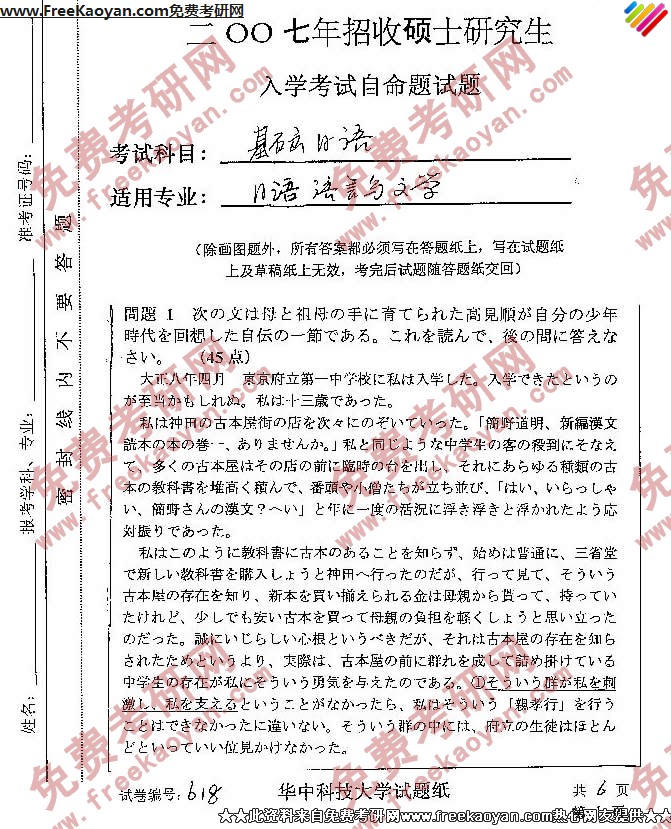 专业课考研经验 本站小编 FreeKaoyan 2018-01-23华中科技大学2007年考研真题-汉语言文学基础